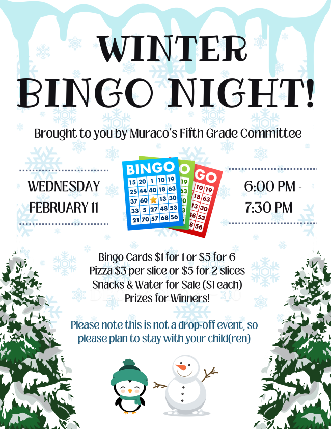 We look forward to seeing the Muraco community for a fun filled night of BINGO, hosted by the 5th grade committee! There will be a variety of prizes for winners at our prize table, as well as pizza slices, snacks, and waters to purchase.